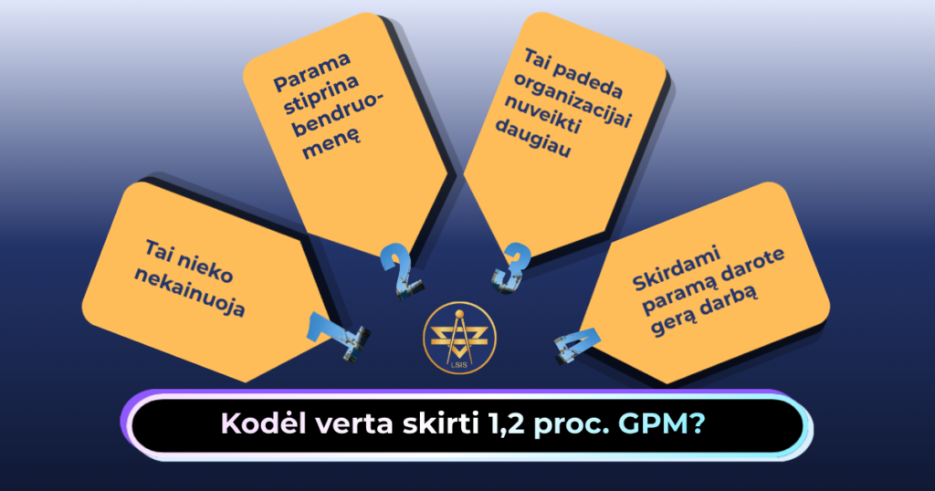 Primename, kad 1,2 proc. parama – tai galimybė Lietuvos gyventojams skirti 1,2 procentų savo sumokėto gyventojų pajamų mokesčio (GPM) įvairioms organizacijoms (įskaitant nevyriausybines organizacijas, labdaros ir paramos fondus, viešąsias įstaigas ir kt.). Šie pinigai būtų tiesiog sumokėti į valstybės biudžetą, jei žmogus jų nepaskirtų konkrečiai organizacijai. Tuo tarpu nevyriausybinėms organizacijoms, tokioms kaip LSIS, tai yra gyvybiškai svarbus pajamų šaltinis.